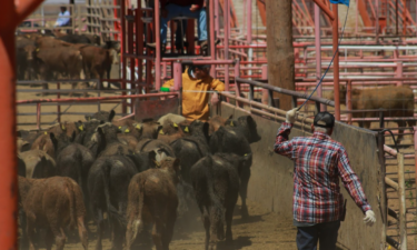 A worker at the Unión Ganadera Regional de Chihuahua on the U.S.-Mexico border guides newly arrived cattle into the proper pen. Photo by Sandra…