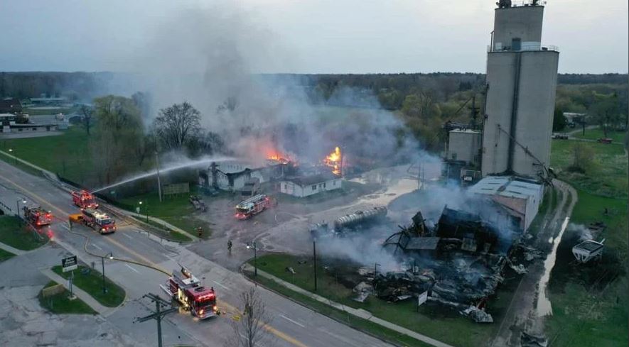 PINCONNING, Michigan (WJRT) — Fire crews in Pinconning are responding to a large fire at the site of a grain elevator, halting traffic along M-13.