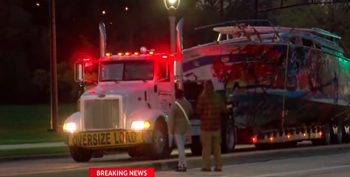 The truck was leaning heavily to the right, but as of 8:30 p.m., the boat is officially gone, with those low tires and a police escort.