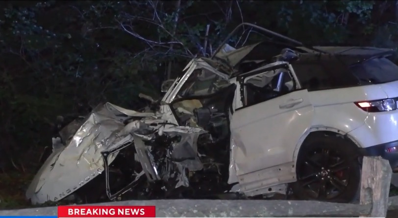 The single-car crash happened on Acapesket Road late Saturday night. Video from the scene showed a white Range Rover SUV with heavy front-end damage. It appeared to have struck a tree not far from the side of the road.