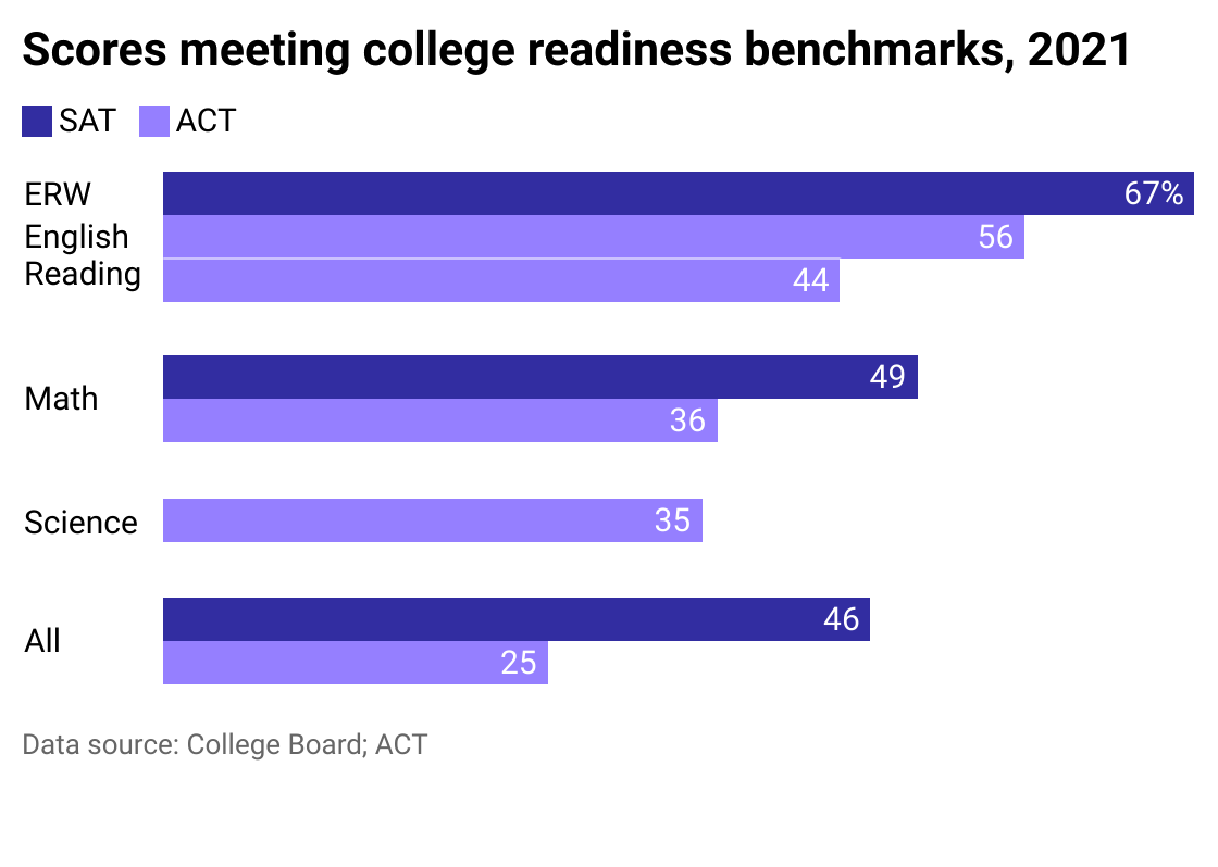 Among SAT test-takers in the class of 2021, less than half met or exceeded the reading, writing, and math college readiness benchmarks, according to the College Board. The benchmarks are the minimums scores that indicate whether students are likely to succeed in college-level courses. The College Board claims that because the number of students taking the test varied so widely because of the pandemic, it was impossible to compare results among classes.