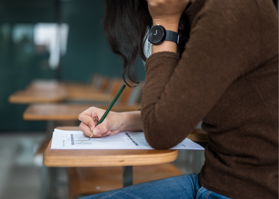 A female student takes a test at a desk