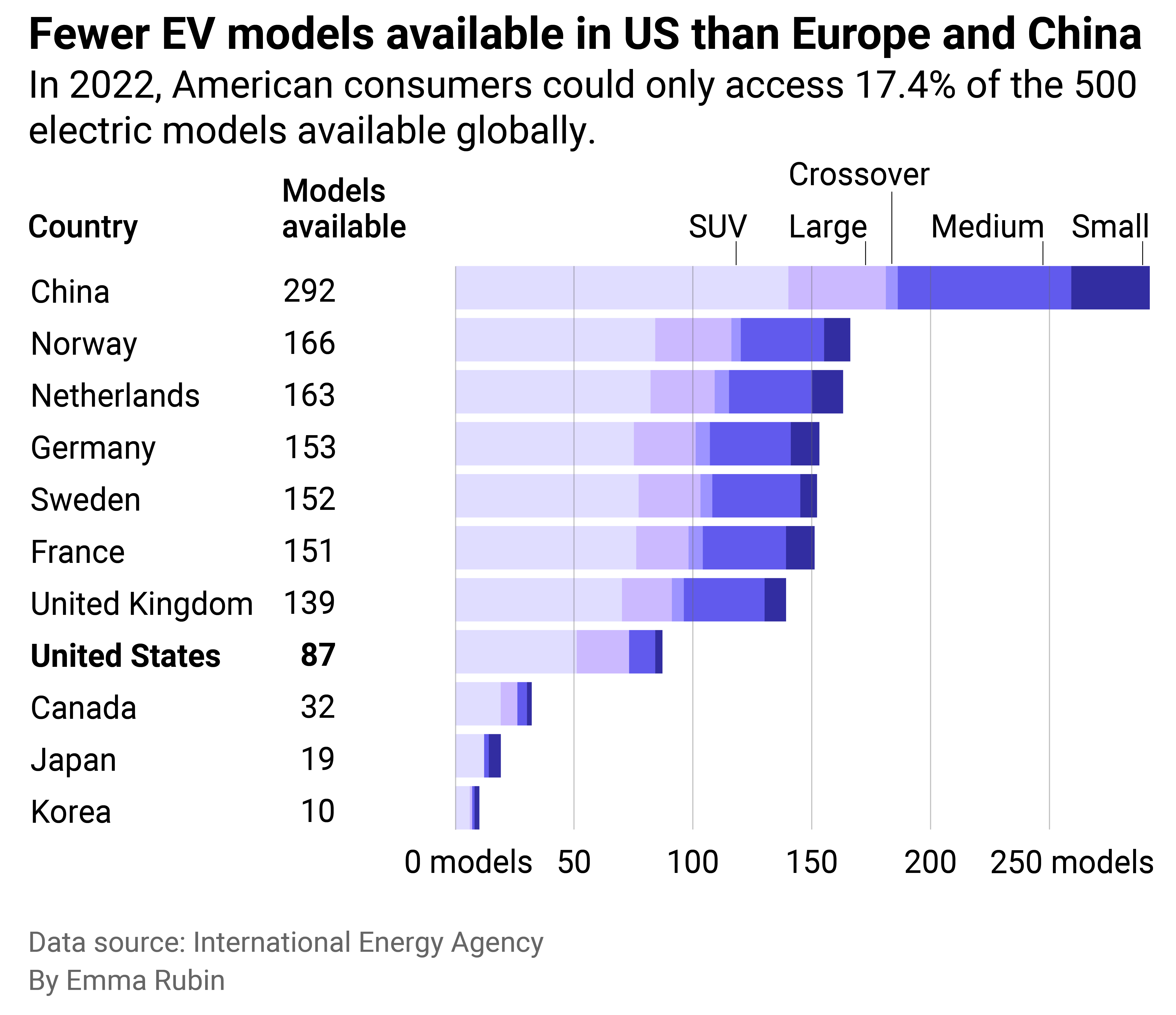 Tax incentives aside, American consumers also have fewer overall options for electric vehicle models compared with other developed countries. China tops the list of nations with the most models available as of this year.