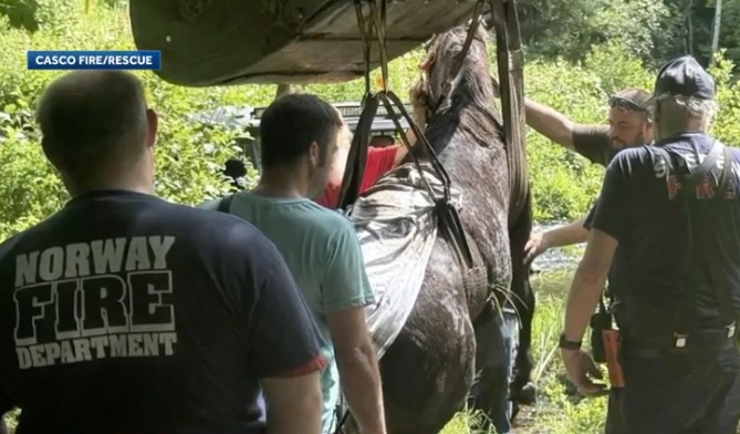 CASCO, Maine (WMTW) — Members of at least six different Maine emergency departments helped rescue a horse stuck in the mud in Casco on Sunday.