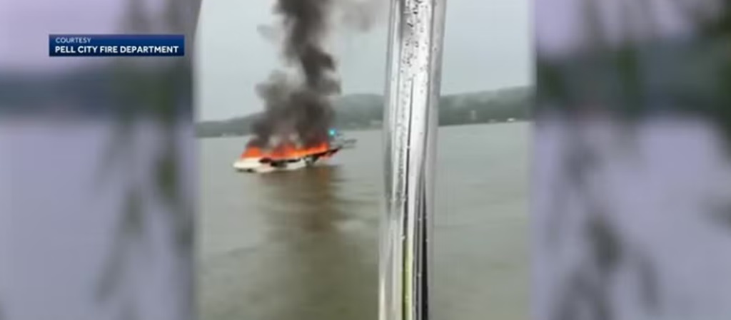 The incident occurred around 3:30 p.m. near Pirate Island, about 150 yards from the shore. Four people were aboard the boat when a storm quickly blew in, and a lightning bolt hit the vessel, causing it to burst into flames.