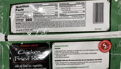 - 20-oz. (1 lb. 4 oz.) plastic bag packages containing frozen “TRADER JOE’S Chicken Fried Rice with stir fried rice, vegetables, seasoned dark chicken meat and eggs” with BEST BY dates 9/8/2026 through 11/17/2026.