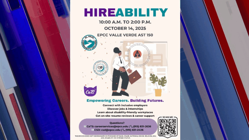 EL PASO, Texas (KVIA) -- As a part of National Disability Employment Awareness month, El Paso Community College (EPCC) will hold a disability-friendly ‘Empowering Careers. Building Futures’ job fair Tuesday, Oct. 14 from 10 a.m. to 2p.m.