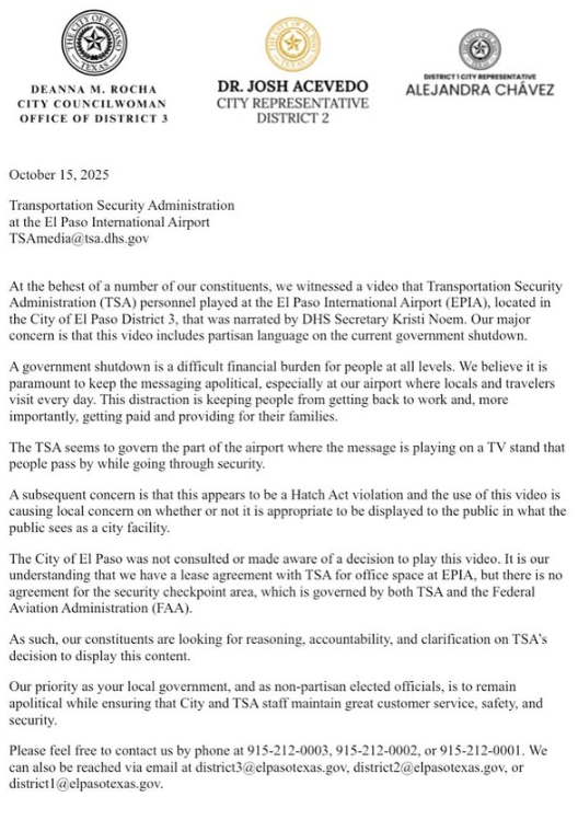 EL PASO, Texas (KVIA) -- El Paso City Council Representative Josh Acevedo says the video of DHS Secretary Kristi Noem attributing the current government shutdown to Democrats is playing at the TSA security checkpoint in the El Paso airport.