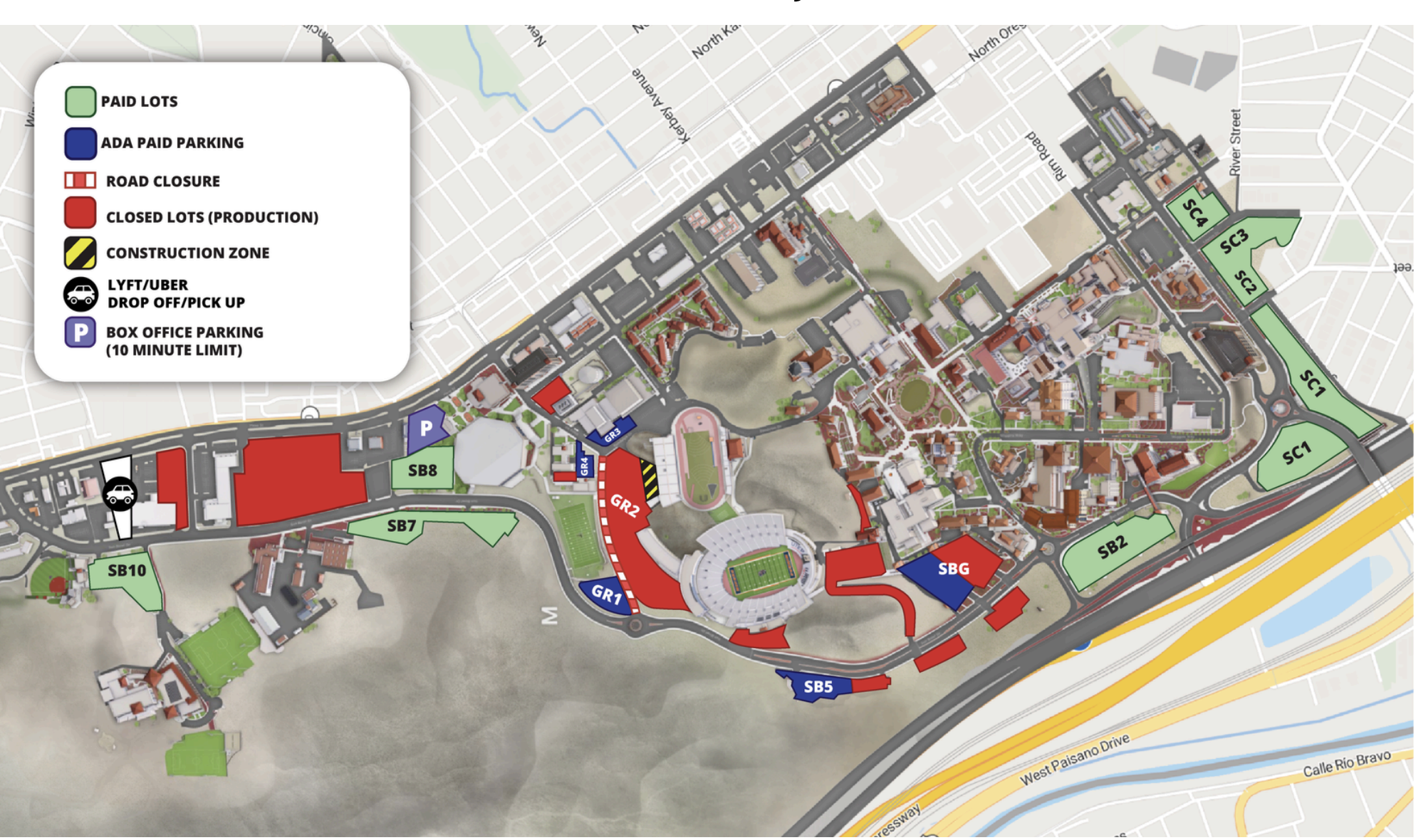 On campus, several designated parking areas are available. ADA-accessible options include Lot 5, located across the street from the Sun Bowl. Additional event parking is available in lots such as SB 21 and SB 11, both within walking distance of the stadium.