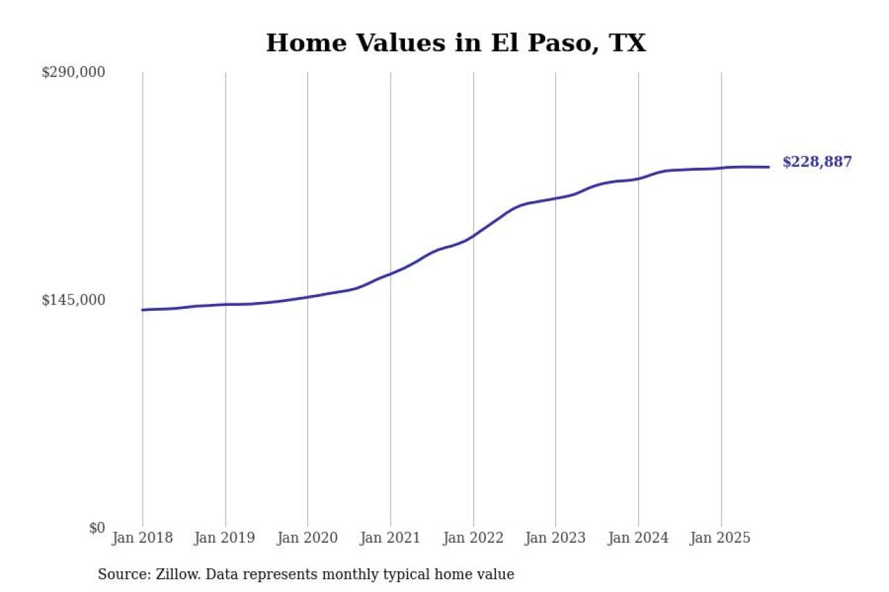 Stacker compiled a list of cities with the most expensive homes in the El Paso metro area using data from Zillow. Charts show the monthly typical home value since January 2018. All 13 cities and towns with data available were included in the list.