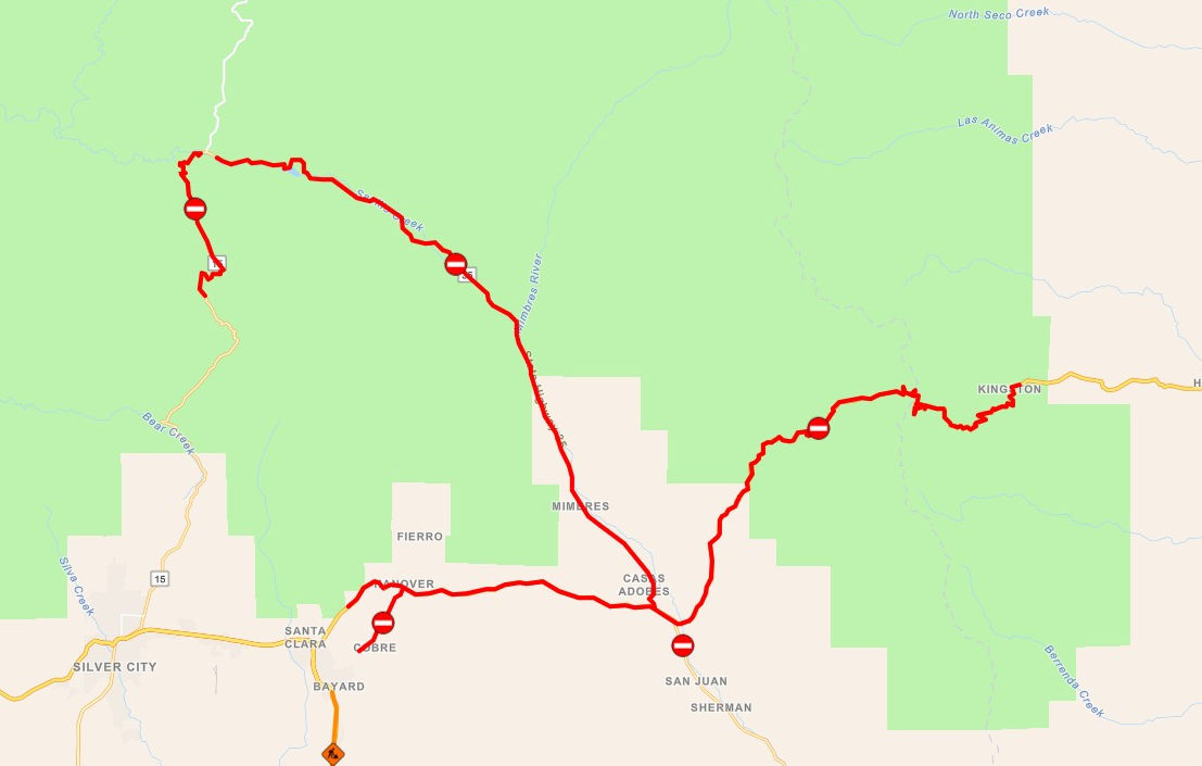 - Closure, NM 152 eastbound from mile marker 2, 2 miles east of Santa Clara to mile marker 40, Kingston. Closed due to forest fire. Roadway to be used for evacuations only.