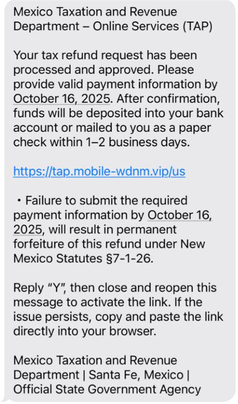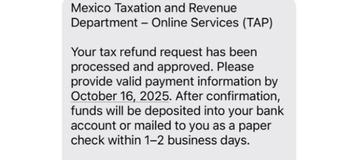 "The public is encouraged to report the number or send a copy of any suspicious text messages to the department’s Tax Fraud Investigations Division by emailing Tax.Fraud@tax.nm.gov or calling the tax fraud hotline at 1-866-457-6789," a department official explained.
