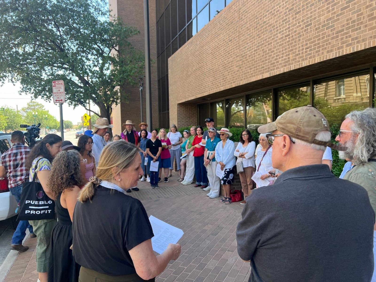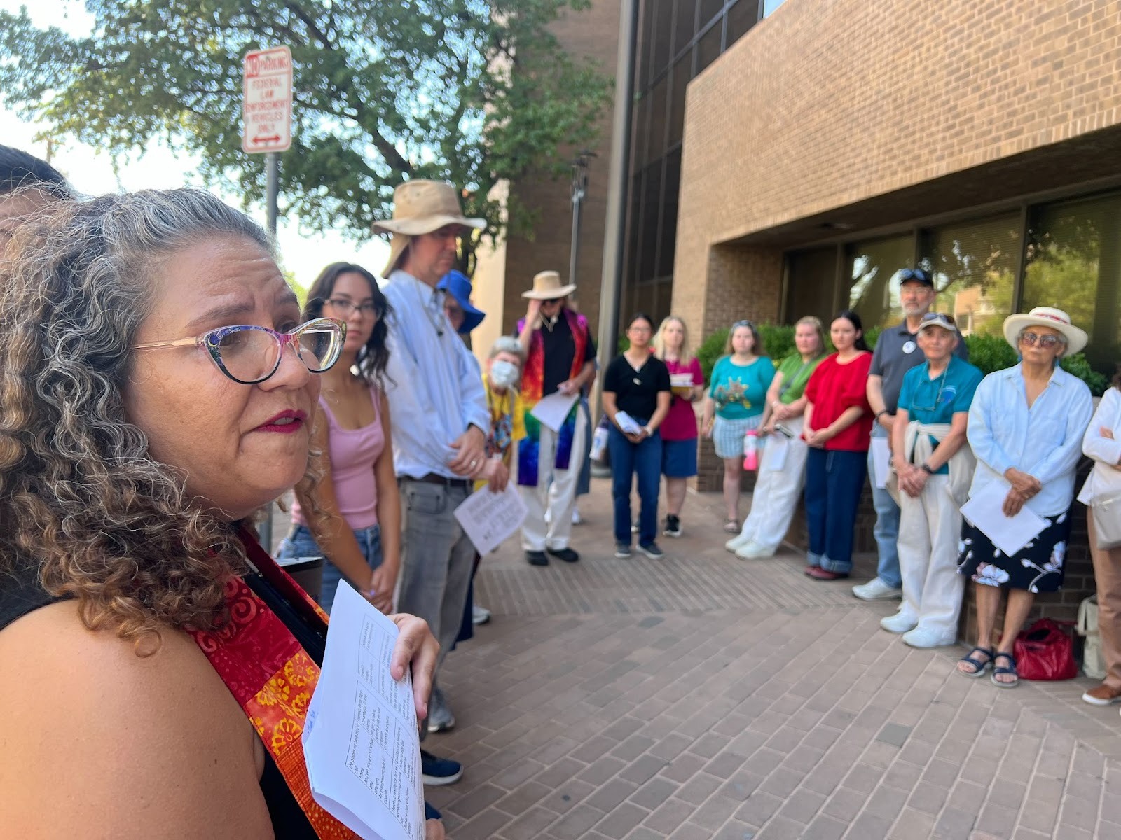 In El Paso, Rev. Marta Pumroy with the Tres Rios Presbyterian Border Foundation recently led dozens of people outside the federal building in song and prayer during an interfaith vigil. Some of the group then went inside to monitor immigration court proceedings.