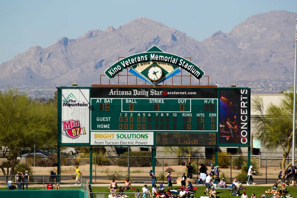 The Santa Catalina Mountains rise behind the scoreboard at Kino Veterans Memorial Stadium. Photo: Courtesy of Kino Sports Complex