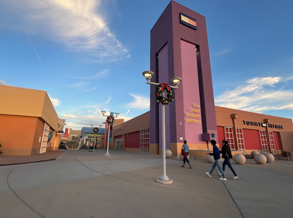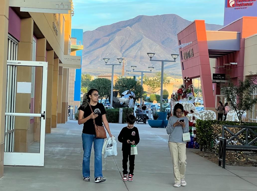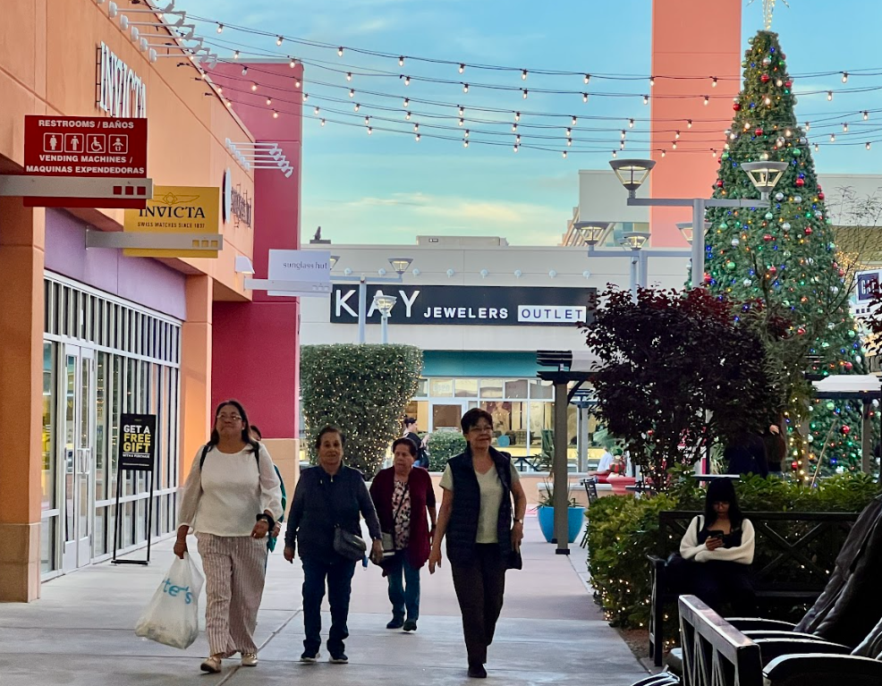 Slechta estimates up to 65% of customers at the Outlet Shoppes at El Paso on weekends are from Mexico. These days, the mall is decked out and full of holiday cheer. People carry large shopping bags and children pose for selfies with a bilingual Santa. A snow machine creates a winter wonderland in the desert southwest at sunset.