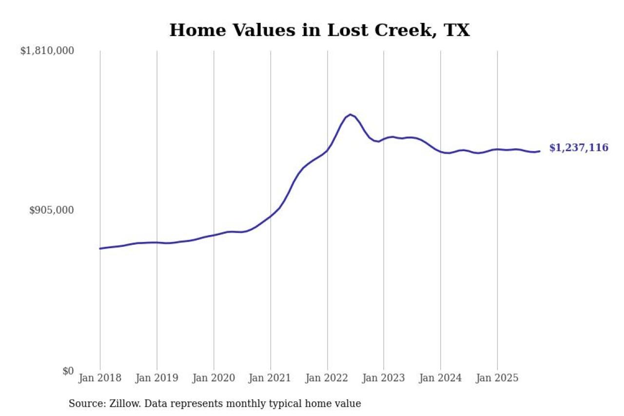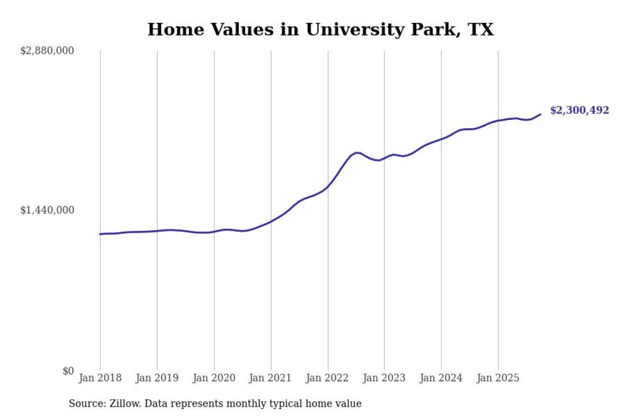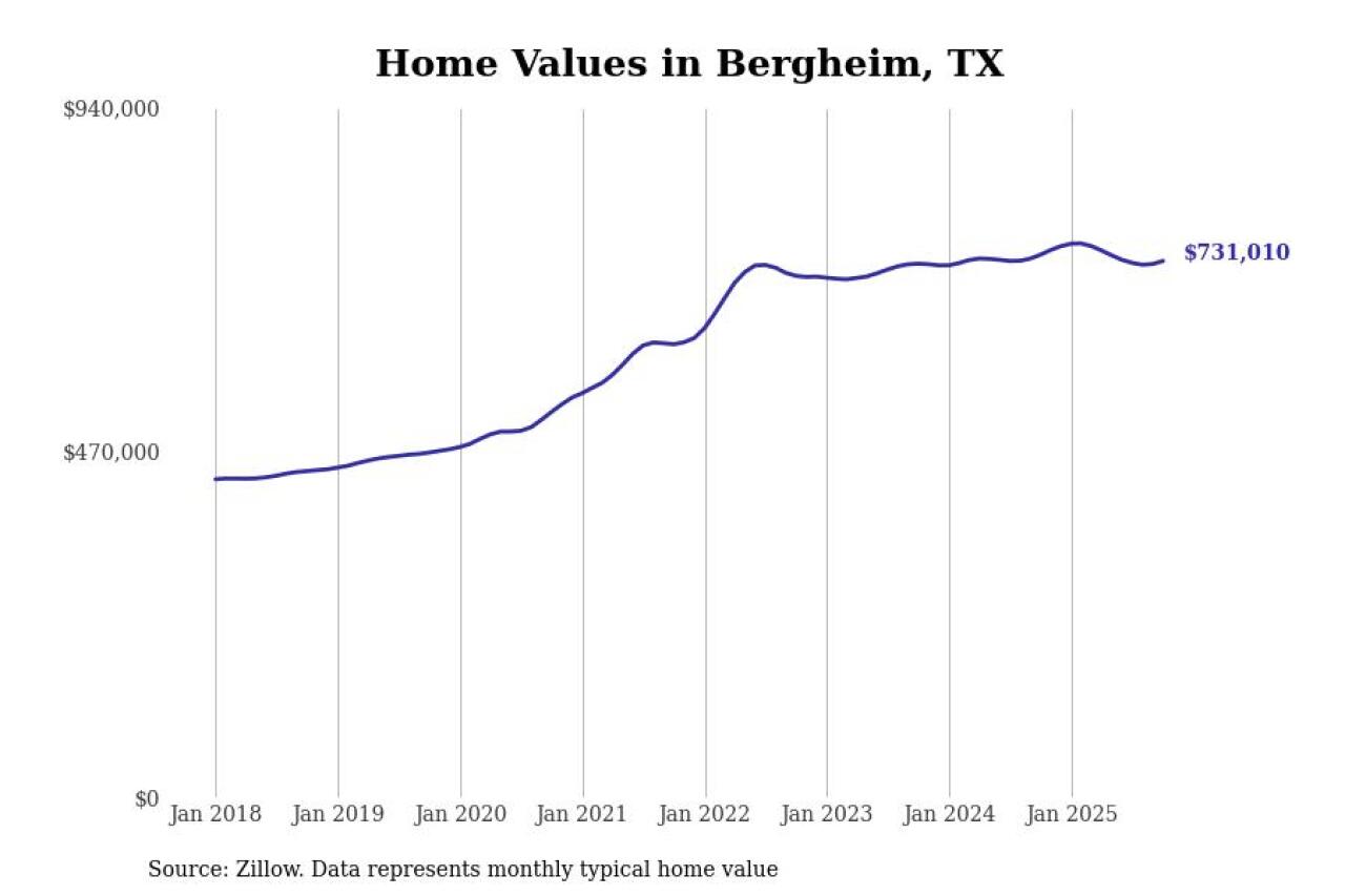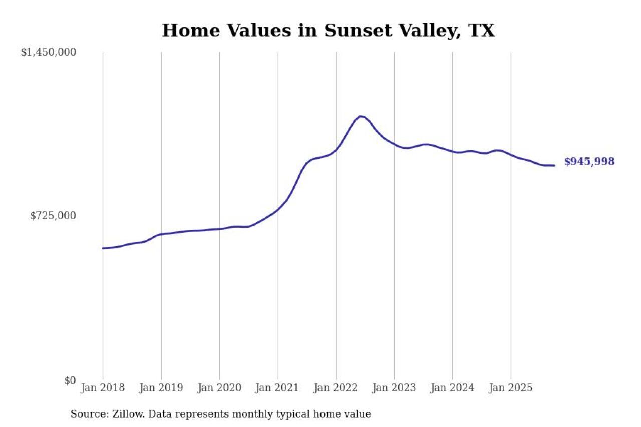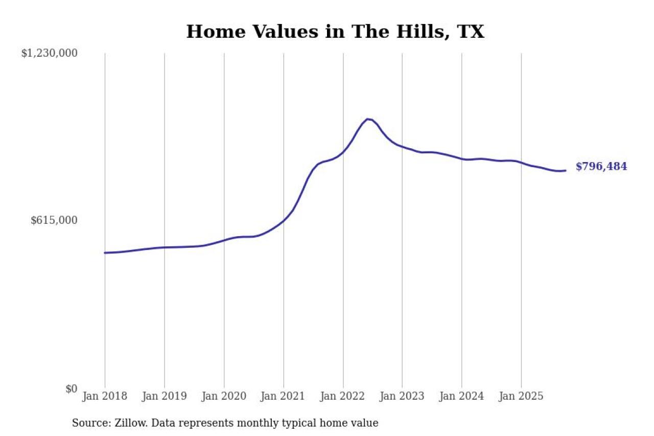 Stacker compiled a list of cities with the most expensive homes in Texas using data from Zillow. Cities are ranked by the Zillow Home Values Index for all homes as of October 2025. The charts in this story were created automatically using Matplotlib.