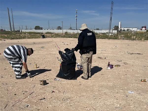 The inmates are trustee volunteers combed the area off Montana Avenue near Red Sands pick up cardboard, spent fireworks, and other debris.