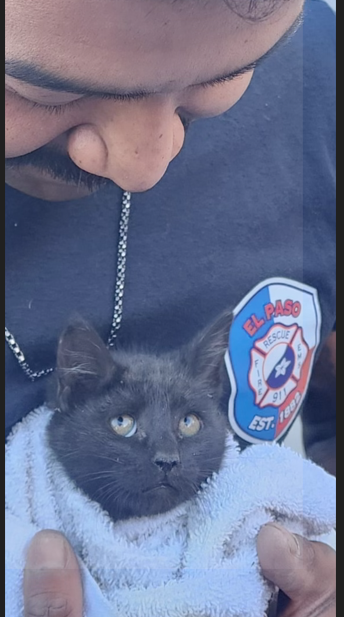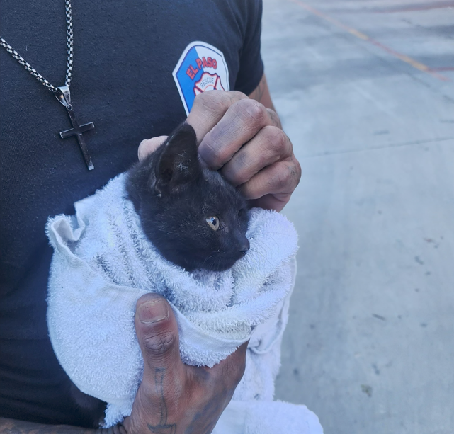 They quickly found the kitten scared and hiding behind the tire of the vehicle. With a little nudging and reassurance, Solis was able to get the stuck kitten out.