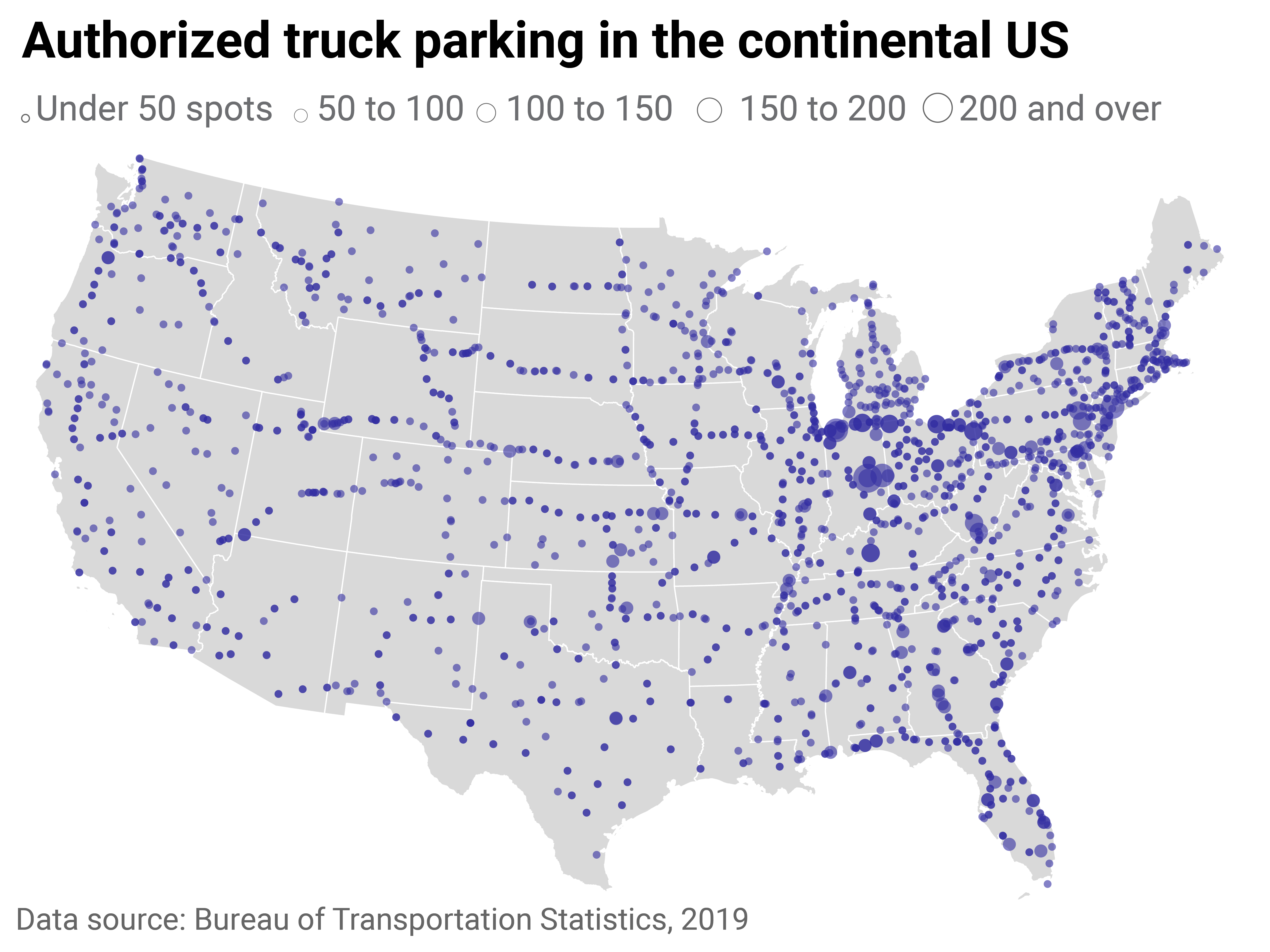 The ATA estimates that drivers waste precious minutes worth about $5,500 annually in pay as they spend time looking for parking. It’s especially hard to find spots near roads connecting major cities in the Southeast, Midwest, and East Coast, as well as along the West Coast and major east-west interstate highways, where truck volume is high, per the DOT.