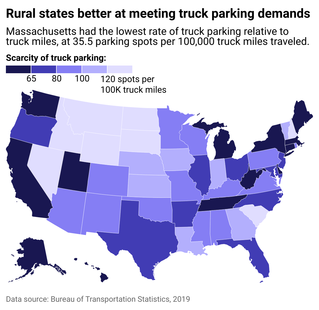 Map showing rural states are better at meeting truck parking demands. Massachusetts had the lowest rate of truck parking relative to truck volume, at 35.5 parking spots per 100K truck miles traveled.