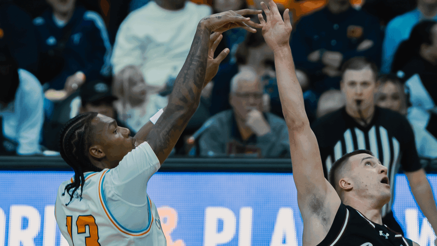 Both teams found rhythm the next few minutes, with things knotted at 16 (11:59,1H) following a triple from Trey Horton III. The Aggies broke the deadlock with five straight points to kick off what would be an 18-3 run and put the Orange and Blue down by double digits (31-19, 5:12, 1H).