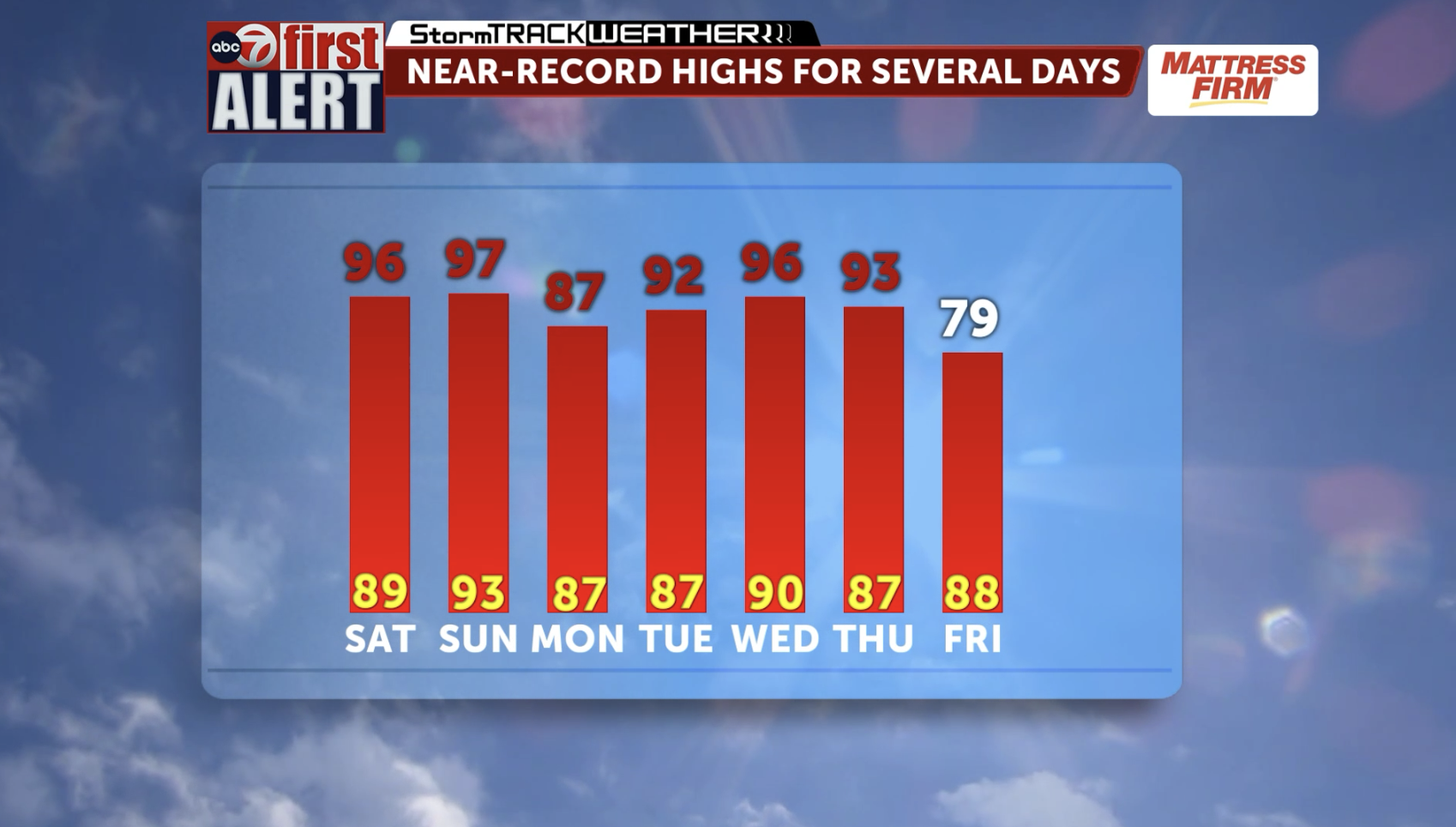 Saturday's record high 89 (2017) could be smashed, the forecasted high is 96 degrees. Sunday's high will be 97 and the record is 93 (2017).