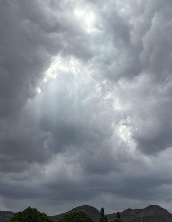 Here are "clouds over the mountains in the Northeast side of town," viewer Lucy Soto explained when she submitted her photos to ABC-7. Soto's photos show rays of light peaking through the dark clouds, and the Franklin Mountains sitting in the background.
